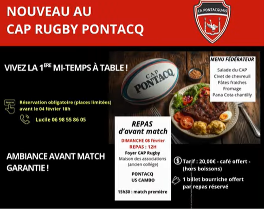 Dimanche 8 février, le CAP Rugby ne se contentera pas de jouer sur le terrain. À l’occasion de la réception de Cambo à 15h30, le club organise un repas d’avant-match ouvert à tous, pensé pour renforcer les liens entre l’équipe, les supporters et le village.