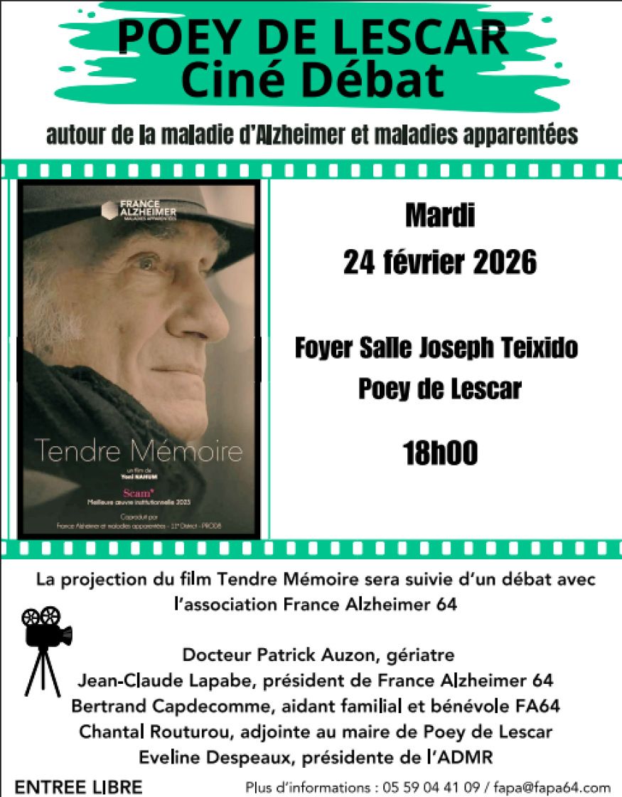 La maladie d’Alzheimer concerne aujourd’hui de nombreuses familles.Pour mieux comprendre la maladie, s’informer et échanger, France Alzheimer 64, en partenariat avec la Ville de Poey-de-Lescar et l’ADMR de Lescar, organise une réunion d’information sous forme de ciné-débat, ouverte à tous.