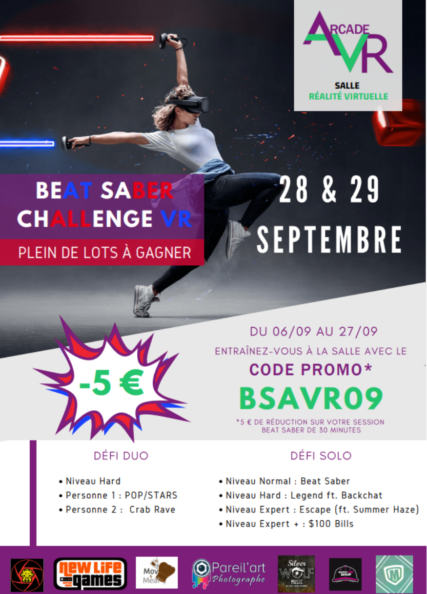 ---Kézako ?* Participez au challenge « Beat Saber », tentez de faire le meilleur score en coupant des cubes avec des sabres lasers au rythme de la musique et remportez plein de cadeaux !