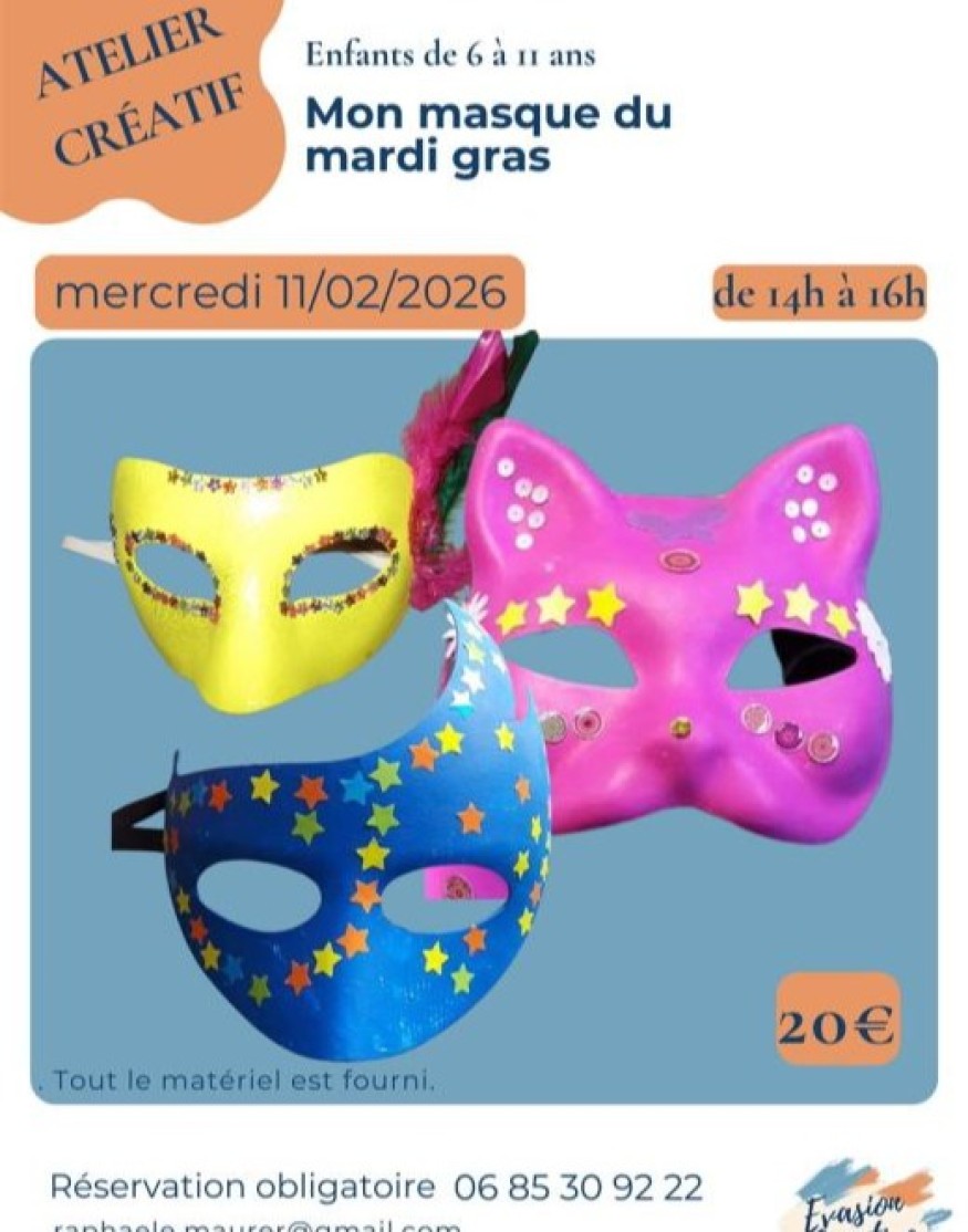 11 février – 14h à 16h Crée ton masque de carnaval Un atelier haut en couleurs pour imaginer et décorer son propre masque de Mardi Gras !Peinture, gommettes, paillettes, plumes… tout est à disposition pour créer un masque original, festif et unique. Les enfants laissent libre cours à leur imagination et repartent avec leur création prête à être portée. Tarif : 20 €Âge : 6 à 11 ansThème : Arts créatifs / Arts plastiquesRéservation obligatoire – places limitées 12 février – 14h à 16h Tableau avec ta figurine préférée en serviette Les enfants réalisent un tableau 20 x 20 cm en combinant peinture, découpage et collage.Une forme centrale est découpée dans une serviette en papier colorée, le fond est peint, puis une figurine décorative est ajoutée pour créer une composition joyeuse et personnalisée. Chaque étape est expliquée pas à pas et tout le matériel est fourni. Tarif : 20 € – 6 à 11 ansRéservation obligatoire – places limitées 13 février – 10h à 12h Mon pense-bête / porte-photos personnalisé Création d’un pêle-mêle décoratif pour accrocher photos, dessins, petits mots et souvenirs.Les enfants décorent leur support avec papiers, peinture et éléments décoratifs, puis installent ficelles et pinces à linge. Un objet pratique, ludique et totalement personnalisé. Tarif : 20 € – 6 à 11 ansRéservation obligatoire 14 février – 10h à 12h Saint-Valentin – Version petits galets Un atelier doux et poétique pour créer un petit tableau carré ou triangulaire à partir de galets naturels.Peinture du fond, collage des galets pour former des personnages, ajout de détails graphiques… chacun compose une scène inspirée de la nature et de l’amour. Tarif : 20 € – 6 à 11 ansRéservation obligatoire – places limitées 16 février – 14h à 16h Peinture, matière et couleurs Les enfants réalisent un tableau en peinture acrylique en découvrant la matière à travers différents outils : pinceaux, spatules, rouleaux, objets…Ils explorent les textures, superpositions et contrastes pour une création libre et expressive. Tarif : 20 € – 6 à 11 ansRéservation obligatoire – places limitées 17 février – 14h à 16h Ton cheval du Nouvel An chinois Réalisation d’un tableau sur toile autour du motif du cheval.Les enfants mettent en couleur les différentes zones, travaillent les contrastes et l’harmonie, puis soulignent les contours au crayon doré pour un rendu lumineux. Tarif : 25 € – 6 à 11 ansRéservation obligatoire – places limitées 18 février – 10h à 12h ou 14h à 16h Customise ton initiale en carton Chaque enfant décore la première lettre de son prénom en carton avec papiers, décopatch, motifs et couleurs.Découpage, collage et assemblage permettent de créer une lettre unique, à accrocher ou poser dans sa chambre. Tarif : 20 € – 6 à 11 ans2 créneaux au choix – réservation obligatoire 19 février – 10h à 12h ou 14h à 16h Décoration murale en pompons Création d’une suspension murale à partir de pompons en laine.Fabrication des pompons, choix des couleurs, assemblage avec perles et fils, puis fixation sur un support en bois pour une décoration douce et chaleureuse. Tarif : 20 € – 6 à 11 ans2 créneaux – réservation obligatoire 20 février – 10h à 12h Avec des galets… Les enfants décorent de beaux galets à la peinture acrylique.Tracés, motifs, couleurs et détails graphiques permettent de créer de véritables petites œuvres d’art, ensuite protégées par un vernis. Tarif : 20 € – 6 à 11 ansRéservation obligatoire – places limitées 21 février – 10h à 12h Fabrique ton attrape-rêve Création d’un attrape-rêve à partir d’un support circulaire ou d’un bâton.Enroulage des fils, tissage, puis ajout de rubans, perles, formes et plumes pour une création magique et personnalisée. Tarif : 20 € – 6 à 11 ansRéservation obligatoire – places limitées Renseignements & réservations : 06 85 30 92 22 Si tu veux, je peux aussi te préparer une version condensée “Programme des vacances créatives” à afficher ou publier en une seule page.